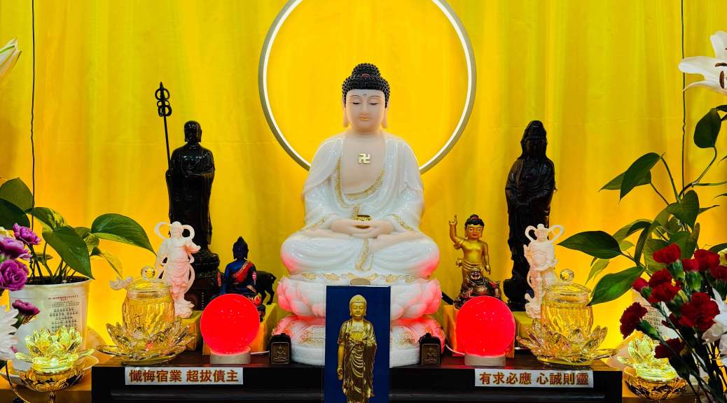 右脅侍大勢至菩薩、教主阿彌陀佛、左脅侍觀世音菩薩。