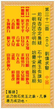 刘备求贤(三顾草庐)。三国时。诸葛亮。字孔明。汉末避居南阳。诸葛亮隐居于隆中之茅屋。志学清修。养生之道。研究奇明门遁法。天文术数。卦算韬略。无所不精。初不求闻达于诸侯。后徐庶荐于刘备。先主刘备与关张三往问计。延为军师。先主即位。拜丞相。受以托孤。后主封为武卿侯。谕有宝心安。得意迟早。静待时机。不请自来。