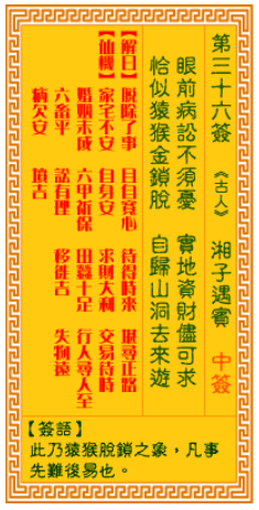 家宅→不安 自身→安 求财→大利 交易→待时 婚姻→未成 六甲→祈保 行人→至 田蚕→十足 六畜→平 寻人→至 公讼→有理 移徙→吉 失物→远 疾病→欠安 山坟→吉