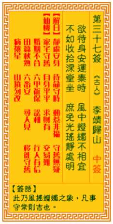 李靖归山。托塔天王李靖。为封神榜人物。塔能镇魔。李靖父子(哪咤)协姜子牙伐纣兴周。周武王立国初论功行赏。李靖父子不恋世间的功名得禄。辞赏归山修道。后父子七人都是肉身成圣。喻风云(名利)与灯烛(修道)不相合。欲要得道。须弃名利。两者不可兼得。