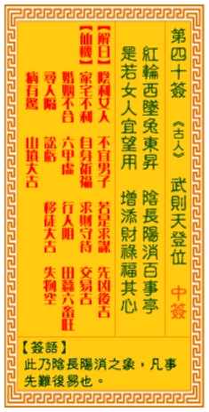 此签主旨,这是属「阴」者出头的时间到了,反之,属「阳」者不利,各种阴阳属性举例如下: