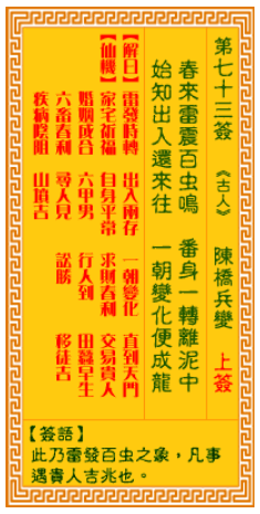 家宅→祈福 自身→平常 求财→春利交易→贵人 婚姻→成合 六甲→男 行人→到 田蚕→早生 六畜→春利 寻人→见 公讼→胜 移徙→吉 失物→ 疾病→险阻 山坟→吉
