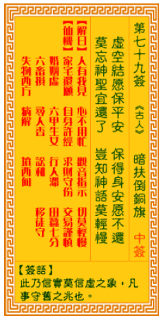 家宅→还愿 自身→许经 求财→守份 交易→谨慎 婚姻→虚 六甲→生女 行人→滞 田蚕→七分 六畜→损 寻人→杳 公讼→和 移徙→守 失物→西方 疾病→解 山坟→西向